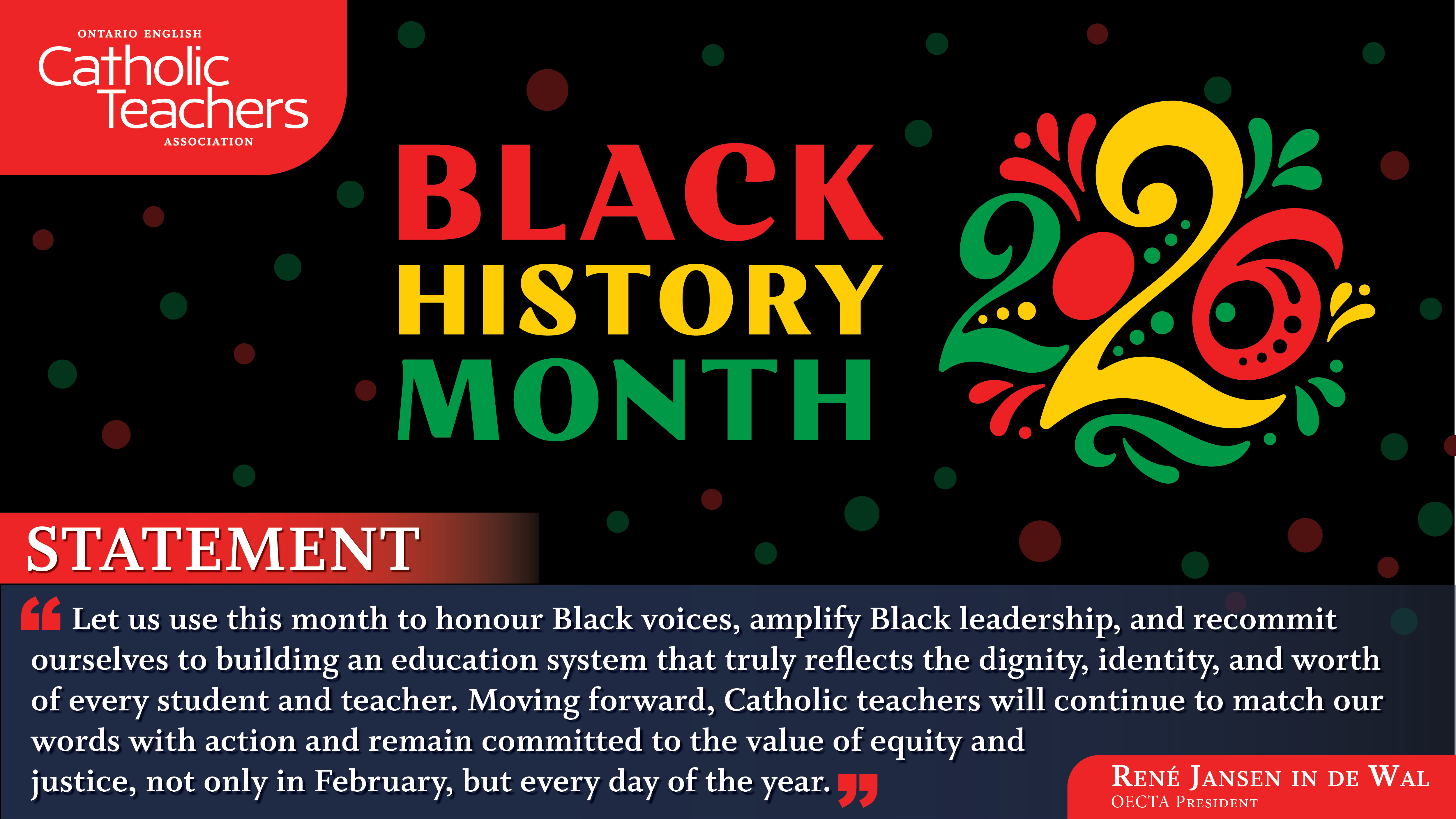 “As Catholic teachers, we are proud to honour Black History Month in our classrooms, schools, and communities. This is a time to celebrate the rich histories, achievements, and cultural contributions of Black people, and to recognize the vital role they continue to play in shaping a more just, compassionate, and inclusive society. It is also a moment to acknowledge that these contributions have too often gone unrecognized.