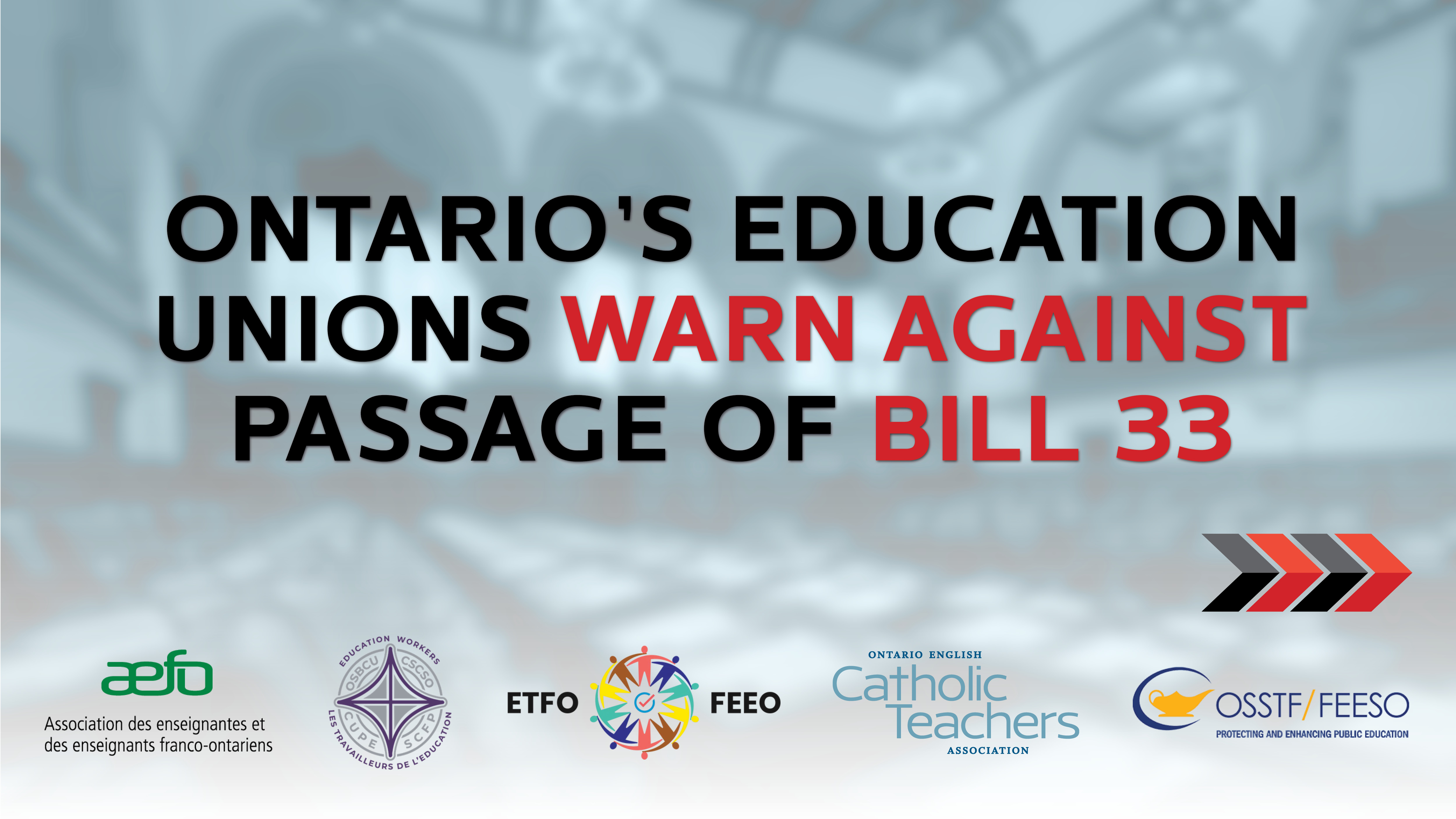 TORONTO, ON — L'Association des enseignantes et des enseignants franco-ontariens (AEFO), Elementary Teachers’ Federation of Ontario (ETFO), Ontario English Catholic Teachers’ Association (OECTA), Ontario School Board Council of Unions (CUPE-OSBCU), and Ontario Secondary School Teachers’ Federation (OSSTF/FEESO) have issued the following joint statement on the expected passage of Bill 33, the Supporting Children and Students Act: