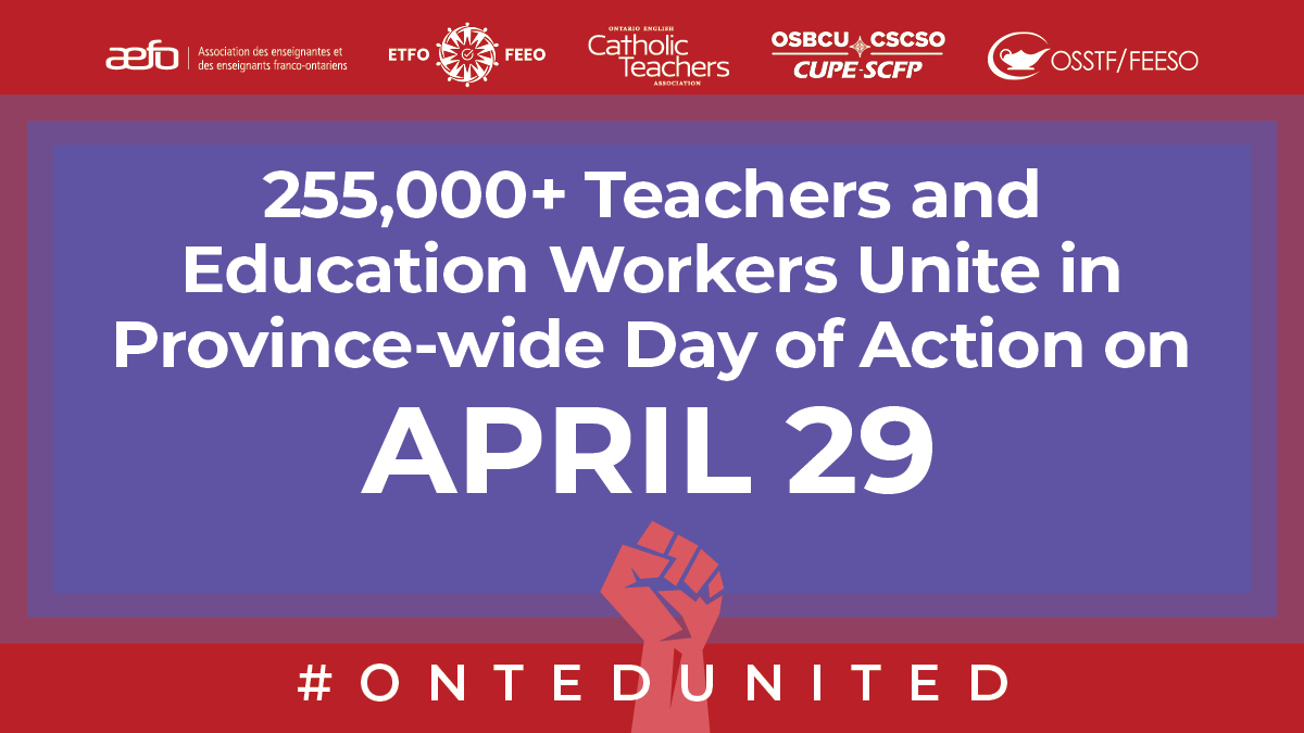 “On April 29, more than 255,000 AEFO, ETFO, OECTA, CUPE-OSBCU, and OSSTF/FEESO members will participate in a Province-wide Day of Action. This coordinated effort represents a powerful show of unity among Ontario’s teachers and education workers at a time when publicly funded education continues to face significant challenges.